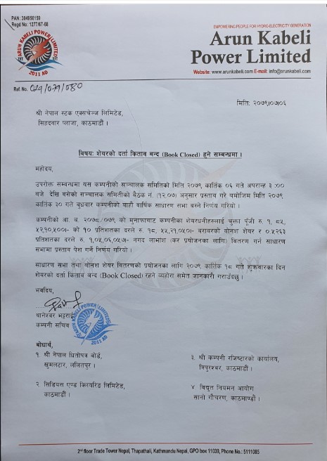 काठमाडौं । अरुण कावेली पावरले साधारणसभा प्रयोजनको लागि कार्तिक १८ गते शुक्रवार बुक क्लोज गर्ने निर्णय गरेको छ । कार्तिक १७ गतेसम्म कायम शेयरधनीले मात्र सभामा भाग लिन र प्रस्तावित लाभांश पाउँन सक्ने छन् ।