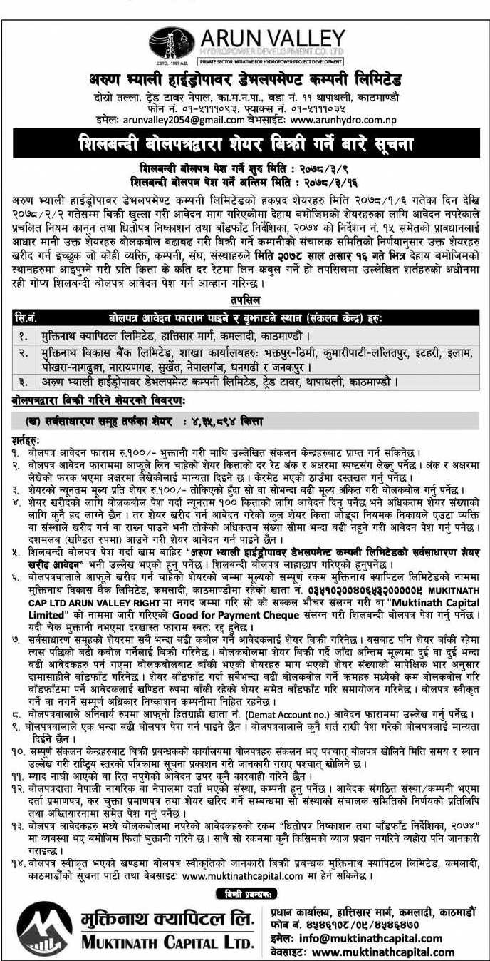 बोलपत्र विक्री प्रबन्धकसँगै मुक्तिनाथ विकास बैंकका शाखा कार्यालय भक्तपुर, कुमारीपाटी, नागढुंगा, नारायणगढ, सुर्खेत, नेपालगञ्ज, धनगढी र जनकपुर साथै अरुण भ्याली हाइड्रोपावर डेभलपमेण्ट कम्पनी थापाथली, काठमाडौंमा प्राप्त गर्न र पेश गर्न सकिनेछ ।