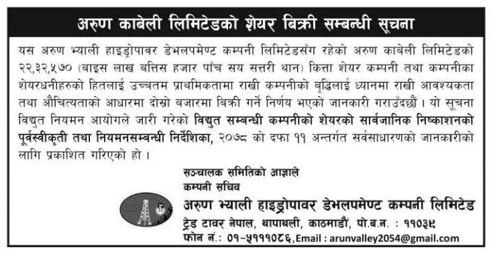 काठमाडौँ । अरूण भ्याली हाइड्रोपावर डेभलपमेन्ट कम्पनी लिमिटेडसँग रहेको अरूण काबेली पावर कम्पनी लिमिटेडको शेयर विक्री हुने भएको छ । कम्पनीले कम्पनीसँग रहेको अरूण काबेली पावरको २२ लाख ३२ हजार ५ सय ७० कित्ता शेयर कम्पनी तथा कम्पनीका शेयरधनीहरुको हितलाई उच्चतम प्राथमिकतामा राखी कम्पनीको वृद्धिलाई ध्यानमा राखी आवश्यकता तथा औचित्यताको आधारमा दोस्रो बजारमा बिक्री गर्ने निर्णय भएको कम्पनीले जनाएको छ ।