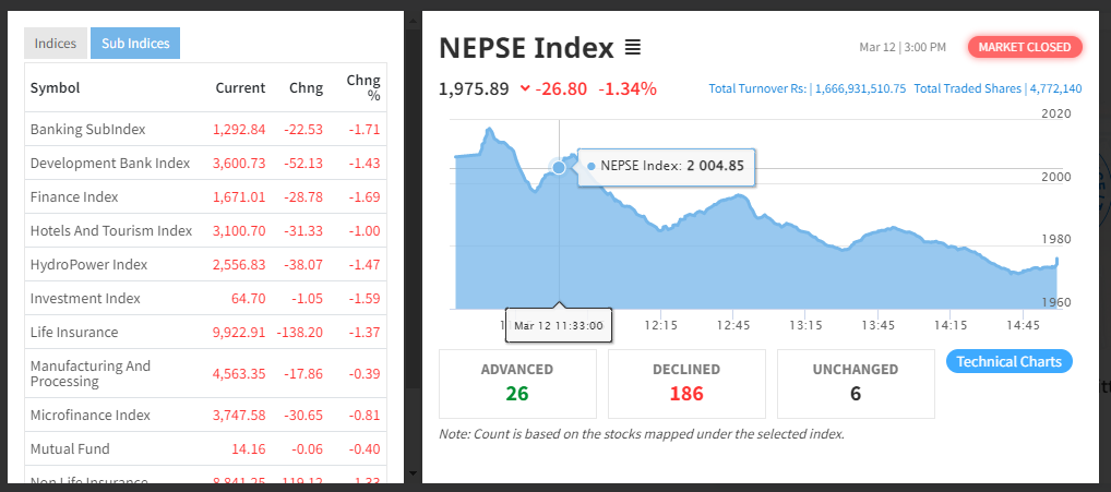 आज नेप्से सूचक २६.८० अंकले घटेर १९७५.८९ अंकमा रोकिएको छ । कारोबार रकम एक अर्ब ६६ करोड नाघेको छ । जम्मा २६ वटा कम्पनीको शेयर मूल्यमा सुधार देखिदा १८६ वटा कम्पनीको शेयर मूल्यमा गिरावट देखिन्छ ।