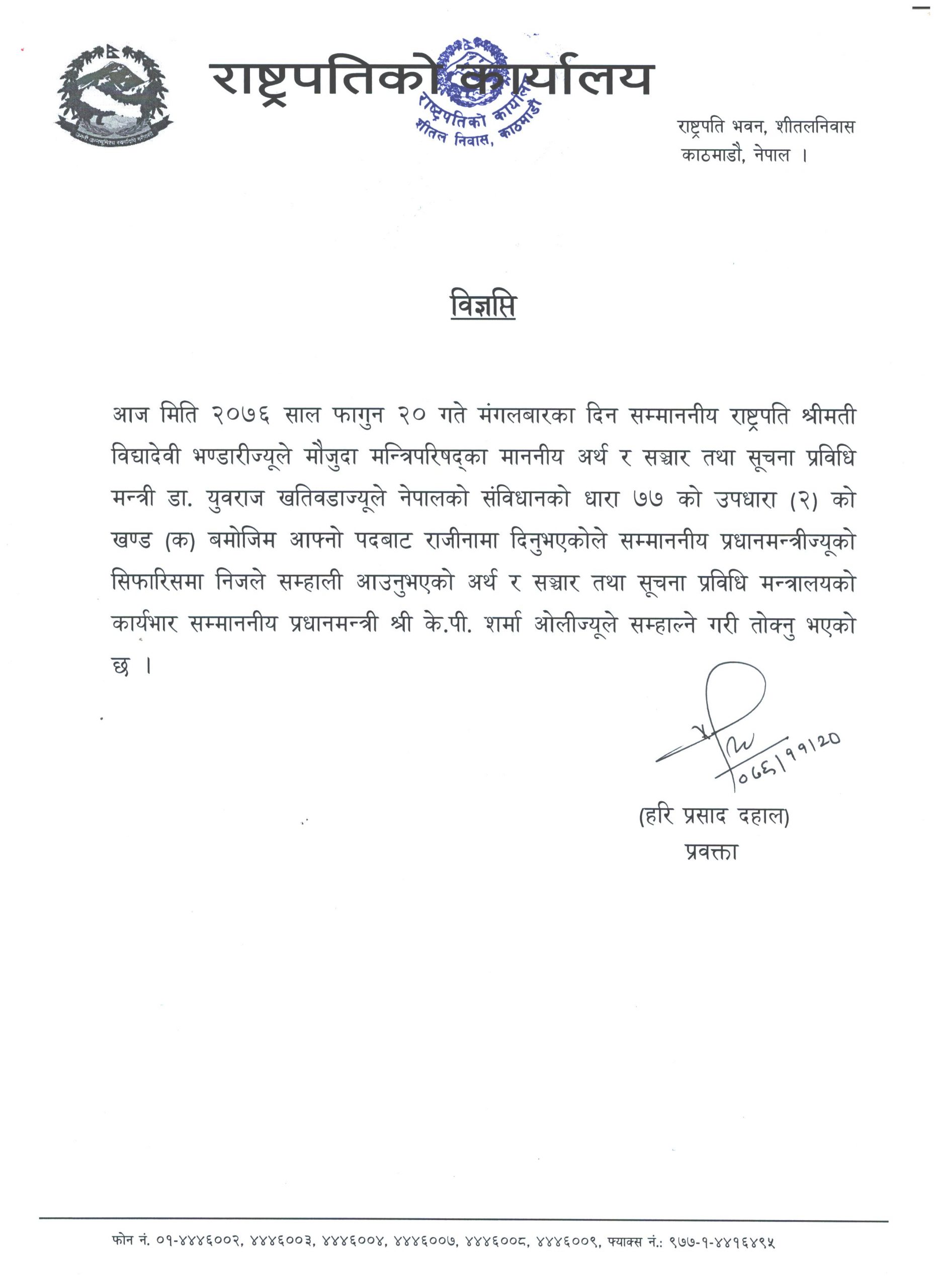 काठमाडौं । अर्थमन्त्री डा. युवराज खतिवडाले आज आफ्नो पदबाट राजिनामा दिएका छन् । स्रोतका अनुसार खतिवडाले आजै राजिनामा दिएका हुन् । उनलाई पुनः अर्थमन्त्री तथा सूचना तथा सञ्चार मन्त्रीमा नियुक्त गर्ने तयारी गरिएको छ ।