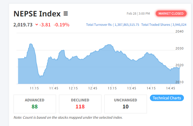 आज मंगलबा नेप्से सूचक ३.८१ अंकले घटेर बन्द भएको छ । सूचक २०१९.७३ अंकमा रोकिएको छ । कारोबार रकम पनि एक अर्ब ३८ करोडमा सिमित भएको छ । सूचक तल झरे पनि नयाँ अर्थमन्त्री आउने वित्तीकै शेयर बजार बढ्ने आकलनले लगानीकर्ताले शेयर बिक्री गर्न मानेका छैनन् ।