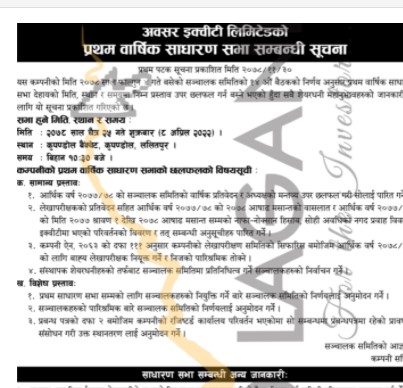 काठमाडौं । अवसर इक्वीटी लिमिटेडको प्रथम वार्षिक साधारण सभा चैत २५ गते हुने भएको छ । सभा कुपण्डोल ब्यङ्क्वेट, ललितपुरमा बिहान १०स्३० बजे शुरु हुने कम्पनीले जनाएको छ । कम्पनीको फागुन ४ गते बसेको सञ्चालक समितिको बैठकले साधारण सभा गर्ने निर्णय गरेको हो ।