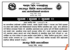 काठमाडौं । मध्यपुर थिमि नगरपालिकाले नगरपालिकाभित्र अवैधानिक रुपमा निर्माकमण गरिएका संरचनाहरु ३५ दिनभित्र हटाउन निर्देशन दिएको छ ।