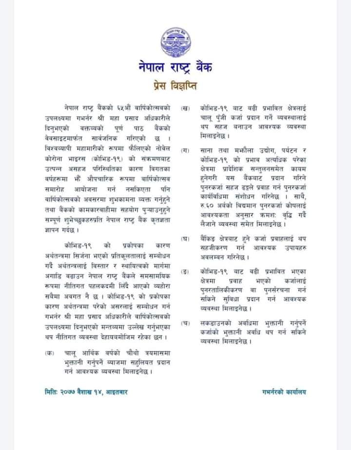 कोभिड–१९ को संक्रमण जोखिमलाई न्यूनीकरण गर्न २०७६ चैत ११ देखि घरभित्रै बस्नुपर्ने व्यवस्था लागू भएको उल्लेख गर्दै स्वास्थ्य सुरक्षाका न्यूनतम उपायहरू अबलम्बन गर्दै बैंकिङ सेवा प्रवाहलाई सुचारु राखिएको तथा अर्थतन्त्रमा पारेको प्रभावलाई सूक्ष्म ढङ्गले अध्ययन गरिरहेको बताउँदै गभर्नर अधिकारीले मुलुकको पर्यटन, उद्योग, व्यापार, व्यवसाय तथा वित्तीय क्षेत्रमा परेको असरलाई ध्यानमा राख्दै सम्बन्धित सबैलाई सहज हुनेगरी केही राहत दिने उल्लेख गरेका हुन् ।