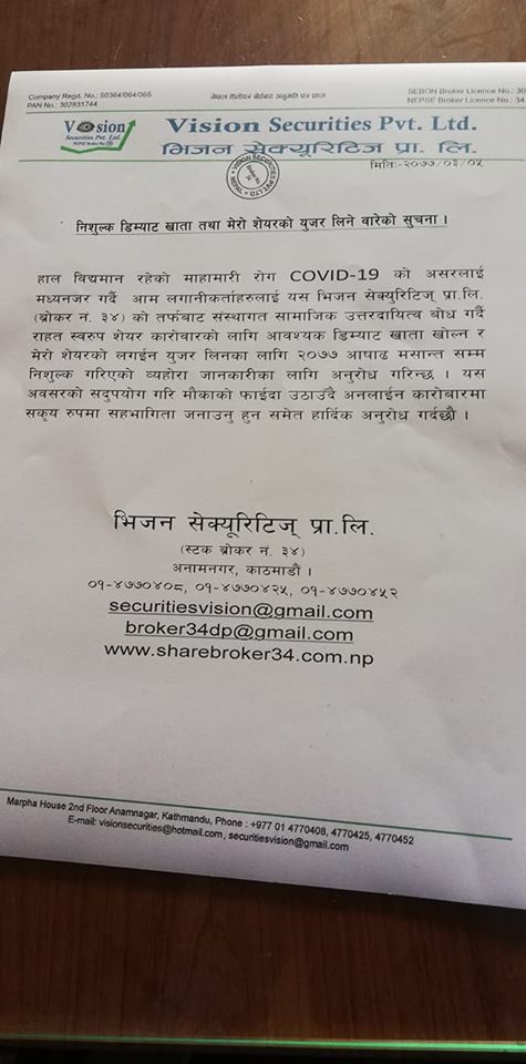 असार मसान्तसम्म भिजन सेक्यूरिटिजमा नि:शुल्क डिम्याट र मेरो शेयर, कसरी सम्पर्क गर्ने ?