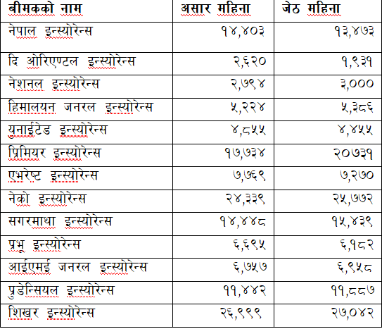 सो अवधिमा शिखर इन्स्योरेन्सले सबैभन्दा धेरै २६ हजार ९ सय ९९ वटा बीमालेख जारी गरेको छ । त्यस्तै, नेको इन्स्योरेन्स कम्पनीले २४ हजार ३ सय ३९ वटा बीमालेख जारी गरेको छ । प्रिमियर इन्स्योरेन्स कम्पनीले १७ हजार ७ सय ३४ वटा बिमालेख जारी गरेको छ ।