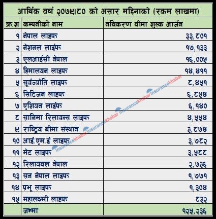 यस अवधिमा सबैभन्दा धेरै नेपाल लाइफ इन्स्योरेन्स कम्पनीले प्रथम बीमा शुल्क आर्जन गरेको छ । कम्पनीले असार महिनामा मात्रै ३ अर्ब ३८ करोड १ लाख रुपैयाँ नविकरण बीमा शुल्क आर्जन गरेको छ । नेशनल लाइफले १ अर्ब ७१ करोड ३३ लाख रुपैयाँ नविकरण बीमा शुल्क आर्जन गरेको छ । एलआइसी नेपालले १ अर्ब ६० करोड ५ लाख रुपैयाँ नविकरण बीमा शुल्क आर्जन गरेको छ । त्यस्तै, हिमालयन लाइफले १ अर्ब ४४ करोड ११ लाख रुपैयाँ नविकरण बीमा शुल्क आर्जन गरेको छ ।