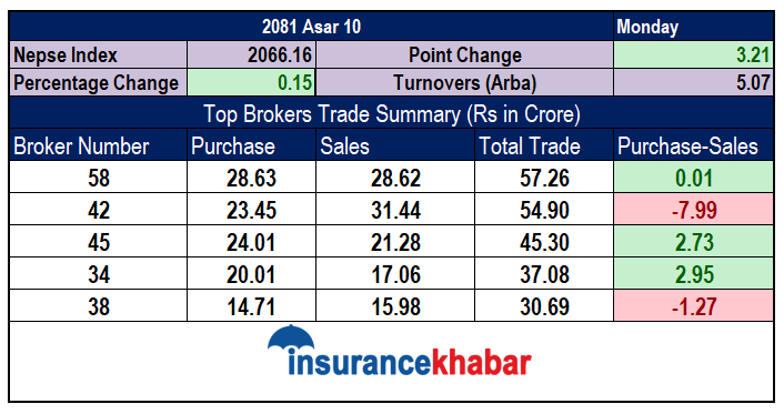 ५ अर्ब ७ करोड कारोबार भएको दिन ब्रोकर नम्बर ५८ बाट सर्वाधिक रकमको कारोबार भएको छ । ब्रोकर नम्बर ५८ बाट ५७ करोड २६ लाखको कारोबार भएको छ जसमा २८ करोड ६३ लाखको खरीद छ भने २८ करोड ६२ लाखको विक्री छ ।