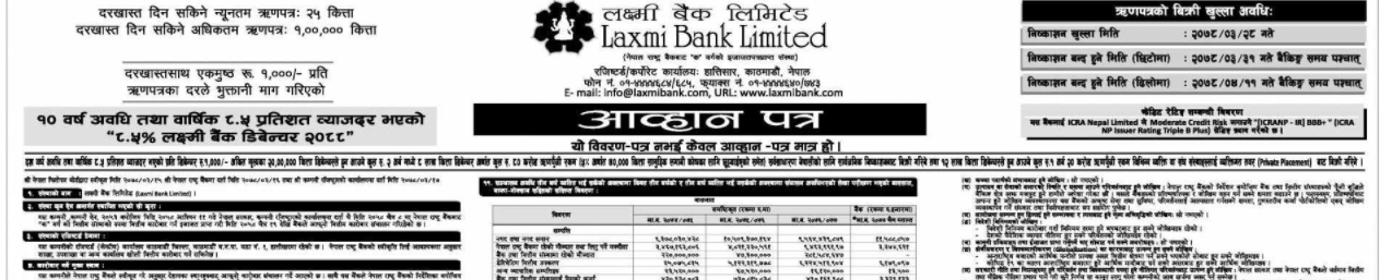 काठमाडौं । लक्ष्मी बैंक लिमिटेडले असार २८ गतेबाट २ अर्ब रुपैयाँ बराबरको ऋणपत्र निष्काशन तथा बिक्री खुल्ला गर्ने भएको छ । बैंकले प्रतिइकाई १ हजार रुपैयाँको अंकित २० लाख कित्ता ऋणपत्र बिक्री खुल्ला गर्ने भएको हो । बैंकले १० वर्ष अवधिको ‘८.५ प्रतिशत लक्ष्मी बैंक डिबेन्चर २०८८’ जारी गर्न लागेको हो । उक्त ऋणपत्रको ब्याजदर वार्षिक ८.५ प्रतिशत हुनेछ ।