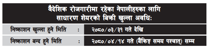 कम्पनीले प्रति शेयर रू.१०० अङ्कित दरमा कर्मचारीहरुको लागि र बाँकीलाई प्रति शेयर रू. १०० अङ्कित दरमा प्रिमियम बापत रू. १४४ थप गरी जम्मा प्रति शेयर मूल्य रू. २४४ मा सर्वसाधारणलाई सार्वजनिक निष्कासन गर्नेछ । कम्पनीले ५ लाख ६२ हजार ५०० कित्ता शेयर प्रति शेयर रू. १०० अङ्कित दरमा कर्मचारीहरुको लागि निष्कासन गर्न लागेको हो । साधारण शेयरको सर्वसाधारणमा निष्कासन गरिने तथा सर्वसाधारणलाई छुट्टाइएको शेयरमध्येको ५ प्रतिशत अर्थात् ५ लाख ६२ हजार ५०० कित्ता शेयर सामूहिक लगानी कोषका लागि सुरक्षित गरी बाँकी रहने ९० लाख कित्ता साधारण शेयरहरूको सार्वजनिक निष्कासन गरिने छ । सर्वसाधारण लगानीकर्ताको लागि भने मिति तय भएको छैन ।