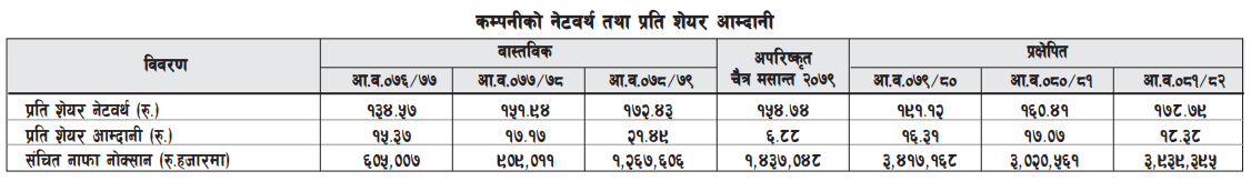 आर्थिक वर्ष ७८/७९ को वास्तविक वार्षिक तथ्यांक अनुसार कम्पनीको प्रति शेयर आम्दानी २१ रुपैयाँ ४९ पैसा रहेको छ भने किताबी मूल्य १७२ रुपैयाँ ४३ पैसा छ । आ.व. ७९/८० को चैत मसान्तसम्मको अपरिष्कृत विवरण अनुसार कम्पनीको प्रति शेयर आम्दानी ६ रुपैयाँ ८८ पैसा र किताबी मूल्य १५४ रुपैयाँ ७४ पैसा रहेको छ ।