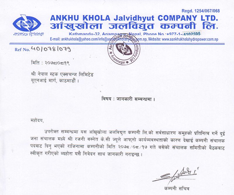 काठमाडौं । आँखुखोला जलविद्युत कम्पनीको सञ्चालकमा सर्वसाधारण समूहको प्रतिनिधित्व गरेको रजनी बस्नेत (के.सी) ले दिएको राजिनामा स्वीकृत भएको छ । उनले आफ्नो कार्यव्यस्तताको कारण देखाई राजीनामा दिएकी हुन् ।
