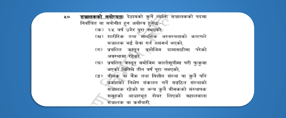 नेपाल लाइफले ‘बीमा ऐन २०७९ को दाफा ५० (ङ) अनुसार बीमक वा बैंक तथा वित्तीय संस्था वा कुनै पनि प्रकारको निक्षेप संकलन गर्ने संङ्गठित संस्थाको सञ्चालक रहेको वा अन्य कुनै बीमकको संस्थापक समूहको आधारभूत शेयर लिएको बहालवाला सञ्चालक वा कर्मचारी सञ्चालकका लागि अयोग्य हुन्छ ।’ भन्ने व्यवस्थामा स्पष्ट नभएको भन्दै तर्क गर्दै आइरहेको छ ।