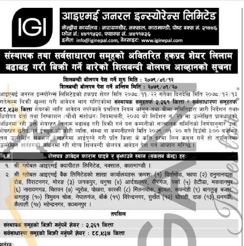 कम्पनीले गत फागुन १२ गतेदेखि चैत १३ गतेसम्म विक्री खुला गरी आवेदन माग गरिएभन्दा कम आवेदन परेको तथा वितरण हुन नसकेको संस्थापक समूहको २ हजार २६१ कित्ता र सर्वसाधारण समूहतर्फको ८८ हजार ९३४ कित्ता शेयर लिलामी प्रक्रियाबाट विक्री गर्न लागेको जनाएको छ ।