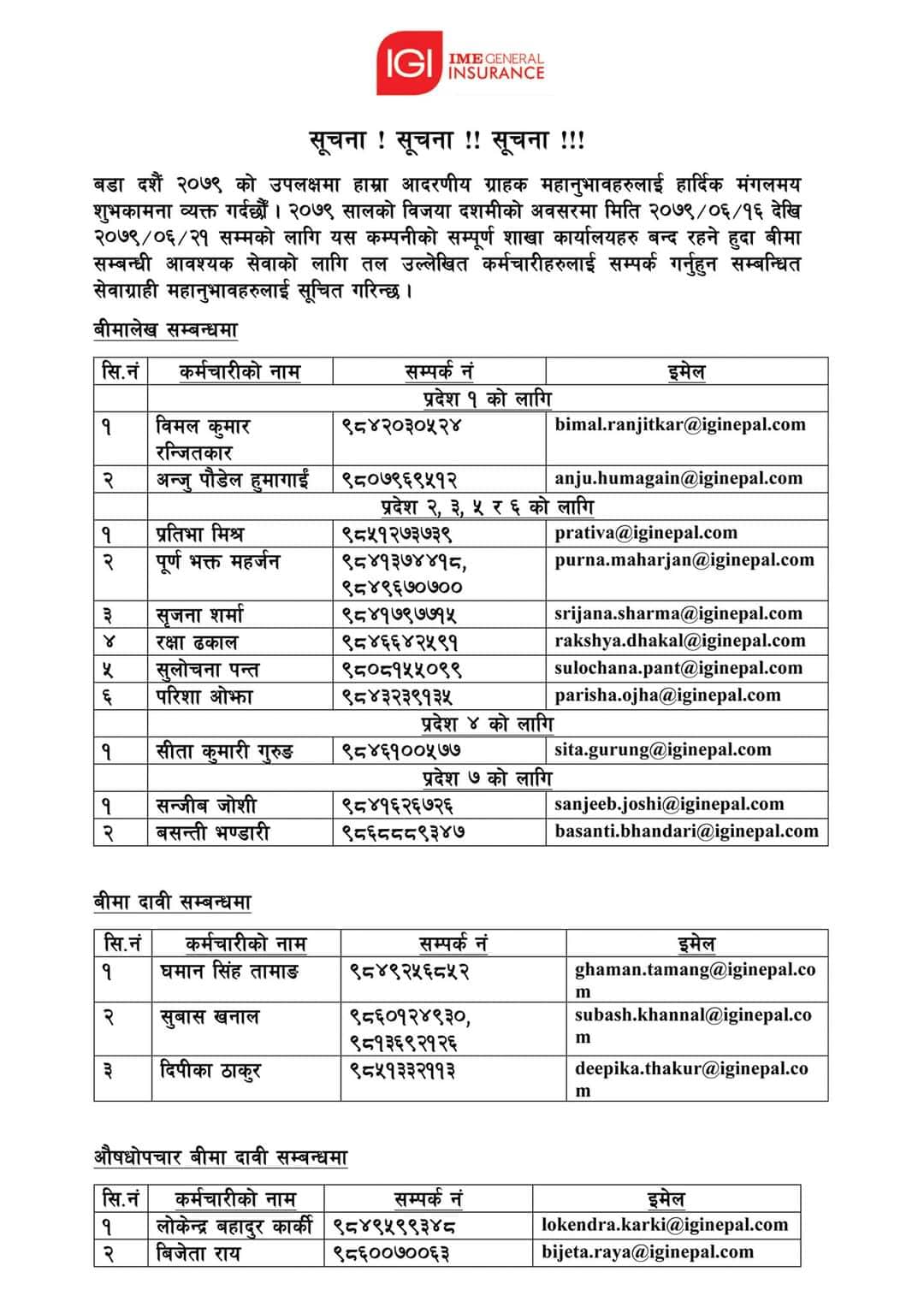 बीमितहरुलाई यो दशै बिदामा कम्पनीको आवश्यक परेको खण्डमा बीमालेख सम्बन्धमा बीमितहरुलाई प्रदेश नं १ का लागि दुईजना कर्मचारी, प्रदेश ३, ४, ५ र ६ को लागि ६ जना कर्मचारी, प्रदेश ४ को लागि २ जना कर्मचारी र प्रदेश नं ७ को लागि २ जना कर्मचारीसँग सम्पर्क गर्नका लागि आग्रह गरेको छ ।