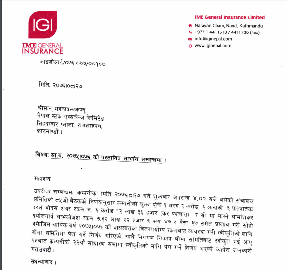 कम्पनीले ६ करोड १२ लाख ३६ हजार रुपैयाँ बराबरको बोनस सेयर बाँड्नेछ । नियामक निकाय र आगामी साधारण सभाले अनुमोदन गरेपछि लगानीकर्तालाई वितरण सुरु गरिनेछ ।