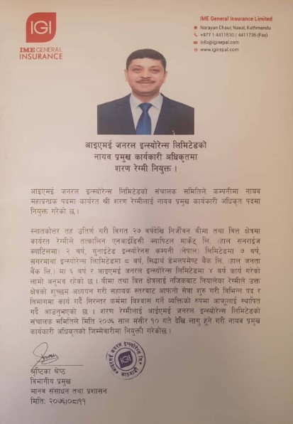 काठमाडौं । आइएमई जनरल इन्स्योरेन्स कम्पनीको नायब प्रमुख कार्यकारी अधिकृतमा शरण रेग्मी नियुक्त भएका छन् । कम्पनीको संचालक समितिको बैठकको निर्णय अनुसार डिसिईओ रेग्मीलाई मंगलबारदेखि जिम्मेबारी दिएको हो ।