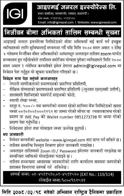 काठमाडौं । आइएमई जनरल इन्स्योरेन्स कम्पनीले आधारभूत निर्जीवन बीमा अभिकर्ता तालिम संचालन गर्ने भएको छ । कम्पनीले अभिकर्ता भई कार्य गर्न ईच्छुक व्यक्तिहरुका लागि आगामी असार २ गतेदेखि असार ४ गतेसम्म तालिम संचालन गर्ने जनाएको छ । तालिम जुम मार्फत संचालन गर्ने कम्पनीले बताएको छ ।