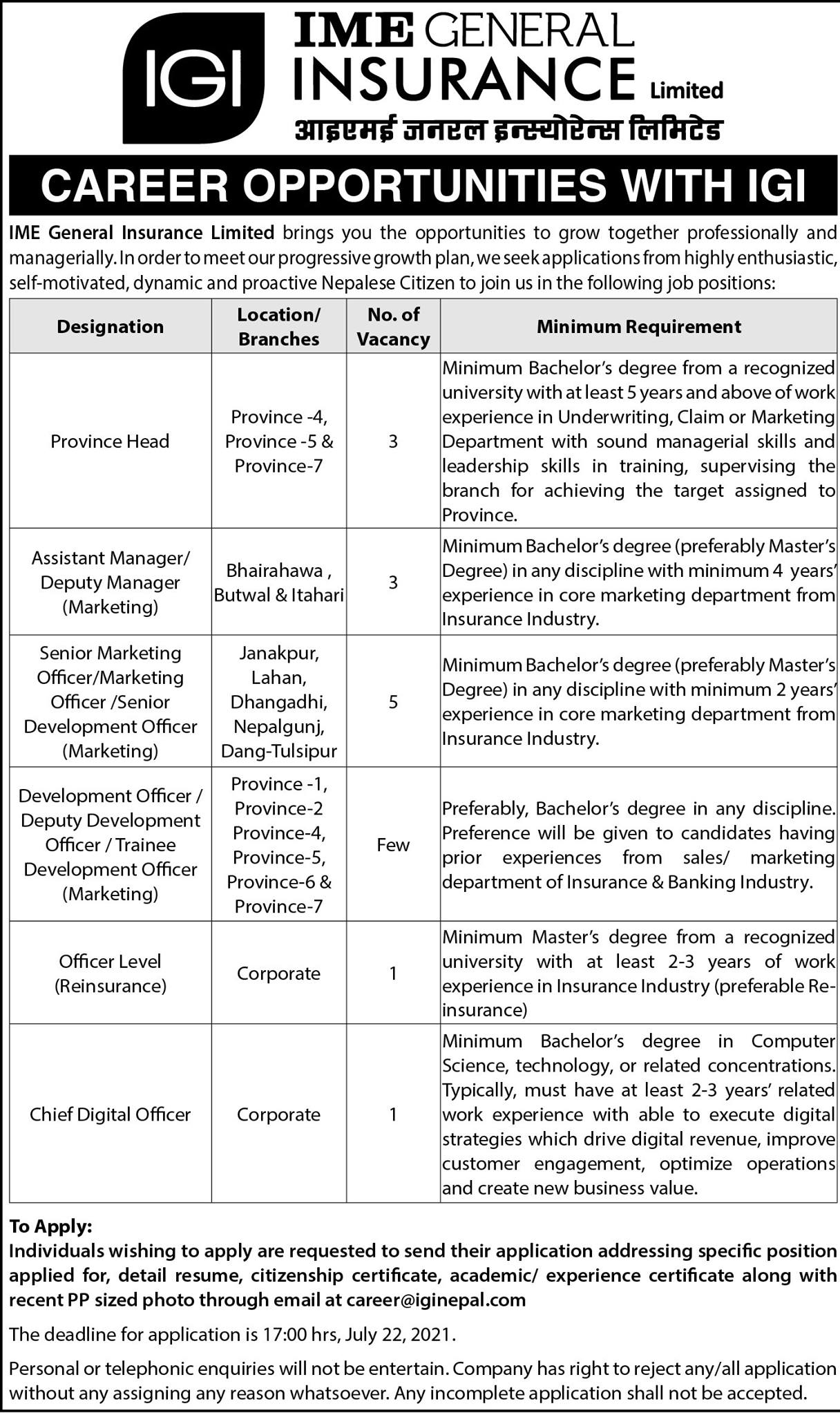 त्यस्तै, कम्पनीले डेभलपमेन्ट अफिसर, डेपुटी डेभलपमेन्ट अफिसर, ट्रेनी डेभलपमेन्ट अफिसर मार्केटिङका लागि केही, रि इन्स्योरेन्स अफिसर लेभलका लागि १ जना र चिफ डिजिटल अफिसरका लागि १ जना कर्मचारीको माग गरेको हो ।