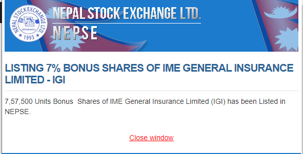 काठमाडौं । नेप्सेमा आइएमई जनरल इन्स्योरेन्स कम्पनीको ७ प्रतिशत बोनश शेयर सुचिकृत भएको छ । कम्पनीको उक्त बोनश शेयर वापतको ७ लाख ५७ हजार ५०० कित्ता शेयर नेप्सेमा सुचिकृत भएको हो ।