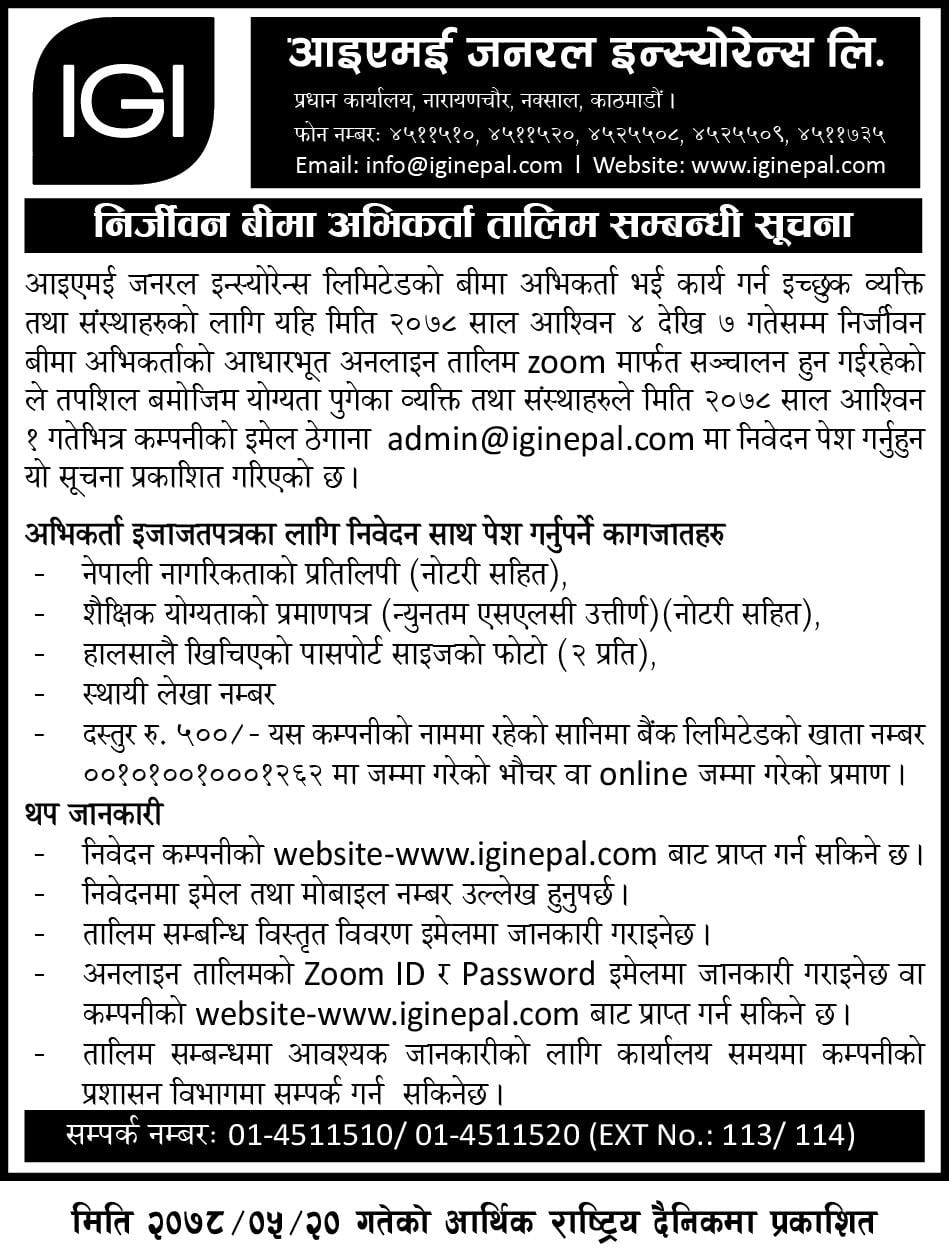 उक्त तालिम अनलाइन जुम मार्फत हुनेछ । ईच्छुक तथा योग्यता पुगेकाले असोज १ गतेभित्र कम्पनीको इमेलमा निवेदन पेश गर्नुपर्ने हुन्छ । अभिकर्ता भई कार्य गर्न चाहानेले नेपाली नागरिकताको प्रतिलिपी, शैक्षिक योग्यताको प्रमाणपत्र, फोटो २ प्रति र नगद दस्तुर ५ सय रुपैयाँ कम्पनीको नाममा रहेको सानिमा बैंकको खाता नम्बरमा जम्मा गरेको भौचर अनलाइन जम्मा गरेको प्रमाण हुनुपर्नेछ ।