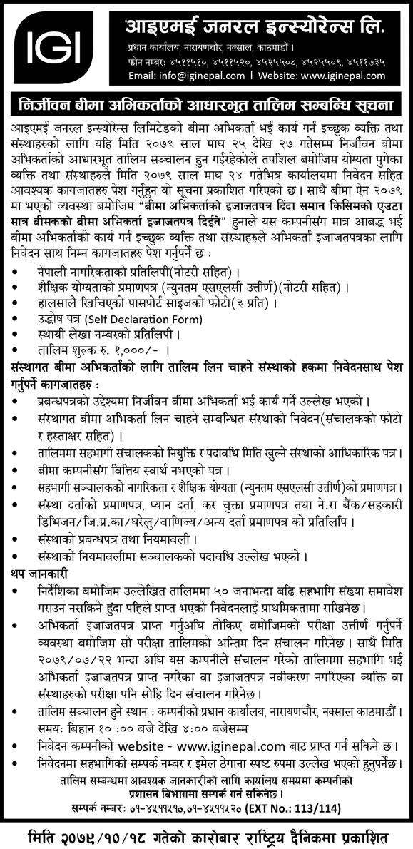 उक्त तालिम कम्पनीको प्रधान कार्यालय नाराणचौर नक्साल काठमाडौंमा विहान १० बजेदेखि दिउँसो ४ बजेसम्म संचालन हुनेछ । तालिममा ५० जनाभन्दा बढी सहभागी नराउने भएको हुँदा इच्छुकले यथाशिग्र सम्पर्क गर्न कम्पनीले आग्रह गरेको छ ।
