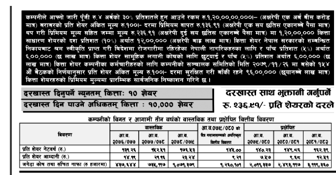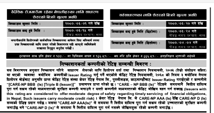 उक्त शेयरमा न्युनतम १० कित्तादेखि अधिकतम १ हजार कित्तासम्मको लागि आवेदन दिन सकिनेछ । उक्त शेयरमा वैदेशिक रोजगारीमा रहेकाहरुले असार १ गतेदेखि असार १५ गतेसम्म् आवेदन दिन सक्नेछन् । त्यस्तै सर्वसाधारण लगानीकर्ताले भने असार २० गतेदेखि छिटोमा असार २४ गतेसम्म आवेदन दिन सक्नेछन् । उक्त छिटो अवधिमा पनि सबैका लागि आवेदन नपरेमा साउन ४ गतेसम्म आवेदन दिन सकिने कम्पनीले जनाएको छ ।