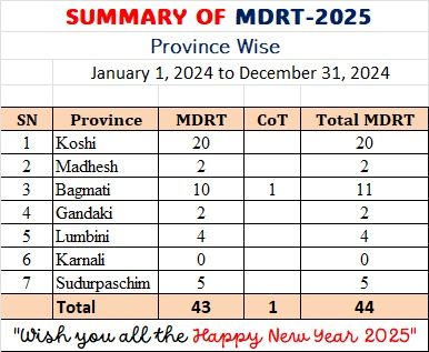 जसअनुसार कोशी प्रदेशबाट २० जना, मधेश प्रदेशबाट २ जना, बागमति प्रदेशबाट १० जना एमडीआरटी र एक जना सीओटी सहित कुल ११ जना, जण्डकी प्रदेशबाट २ जना, लुम्बिनी प्रदेशबाट ४ जना, सुदुरपश्चिमबाट ५ जना सहित २०२५ का लागि कुल ४४ जना अभिकर्ताले उक्त लक्ष्य हासिल गरेका हुन् ।