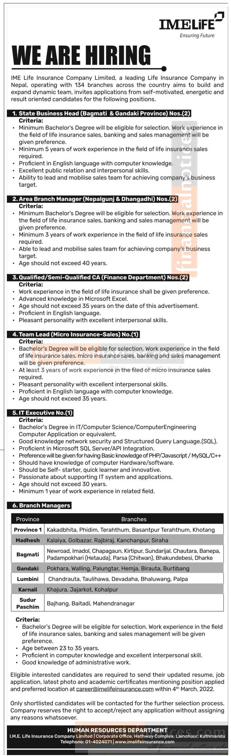 काठमाडौं । आइएमई लाइफ इन्स्योरेन्स कम्पनी लिमिटेडले धेरै संख्यामा कर्मचारीको माग गरेको छ । कम्पनीले सातै प्रदेशका लागि कर्मचारीको माग गरेको हो । कम्पनीले स्टेट विजनेश हेड९बागमति र गण्डकी प्रदेश०का लागि २ जना, एरिया ब्रान्च म्यानेजर(नेपालगञ्ज र धादिङ)का लागि २ जना, सिएका लागि २ जना, टिम हेडका लागि १ जना, आइटि एक्ज्युकिटिभका लागि एकजना र सातै प्रदेशका लागि कम्पनीको विभिन्न शाखामा ब्रान्च म्यानेजरको लागि माग गरेको जनाएको छ ।