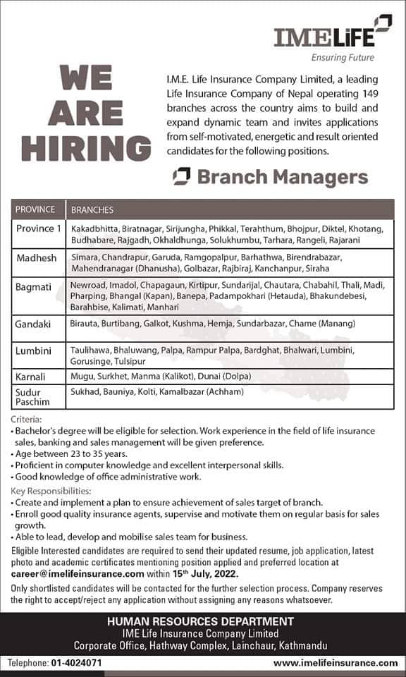 ब्रान्च म्यानेजर पदका लागि स्नातक तह उत्तीर्ण भएको हुनुपर्ने कम्पनीले जनाएको छ । ईच्छुक तथा योग्यता पुगेका ब्यक्तिले असार ३१ गतेभित्र आवेदन दिनुपर्नेछ ।