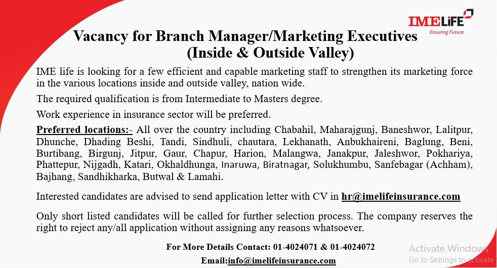 आइएमई लाइफ इन्स्योरेन्स कम्पनीले विभिन्न पदमा कर्मचारी माग गरेको छ । कम्पनीले ब्राञ्च म्यानेजर र मार्केटिङ एक्जिक्युटिभ पदका लागि कर्मचारी माग गरेको हो ।