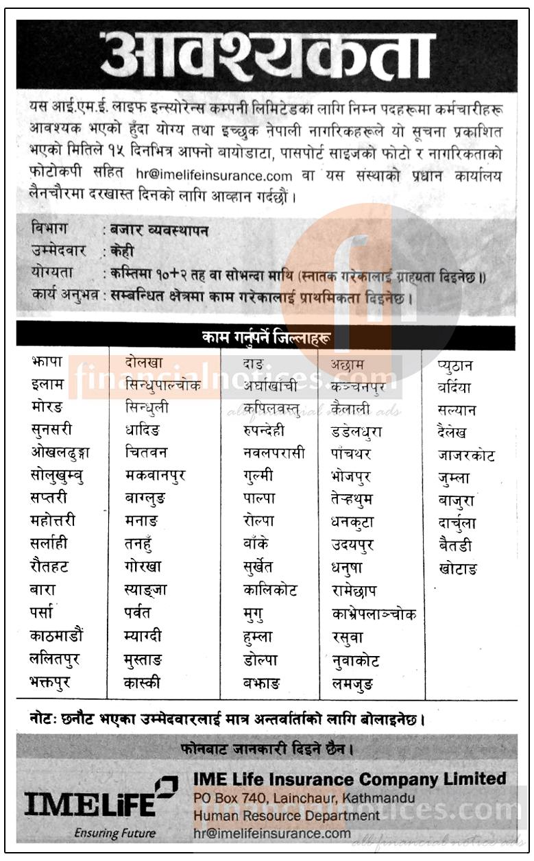 आइएमई लाइफ इन्स्योरेन्स कम्पनी लिमिटेडमा रोजगारी खुलेको छ । इन्स्योरेन्सले बजार व्यवस्थापन विभागमा कर्मचारी माग गरेको हो ।