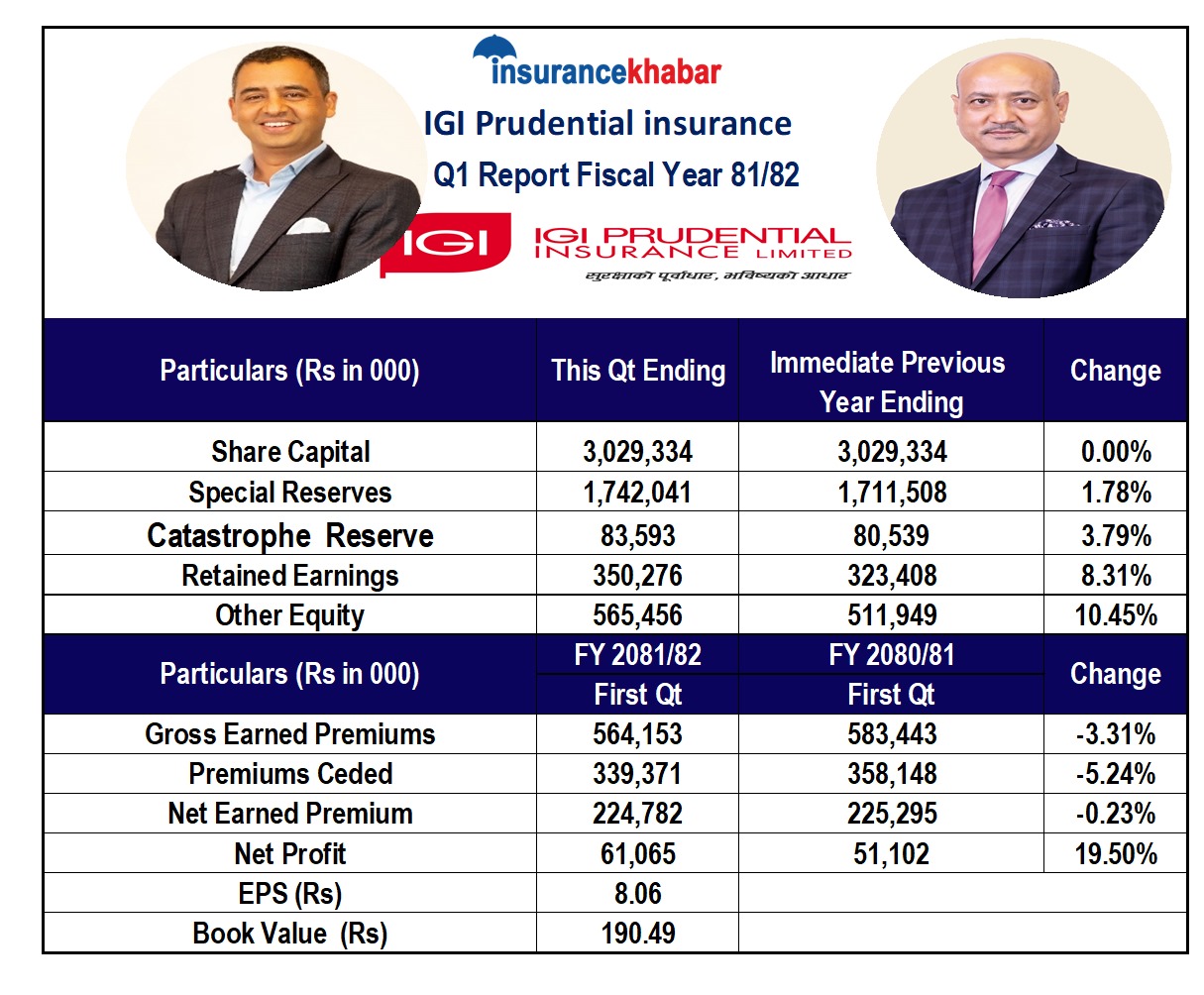 काठमाडौं । आइजिआई प्रुडेन्सियल इन्स्योरेन्स कम्पनीले आर्थिक वर्ष २०८१/८२ को पहिलो त्रैमाससम्मको अपरिष्कृत वित्तीय विवरण प्रकाशन गरेको छ । वित्तीय विवरणअनुसार कम्पनीको नाफा बाहेक अधिकांश सूचकमा सामान्य गिरावट देखिएको छ ।