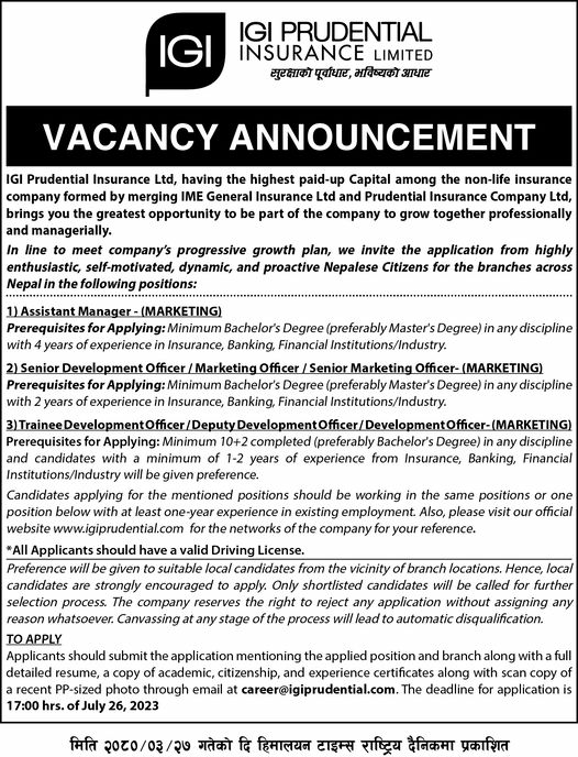 काठमाडौं । आइजीआई प्रुडेन्सियल इन्स्योरेन्स कम्पनीले विभिन्न पदका लागि कर्मचारी माग गरेको छ । कम्पनीले अस्सिटेन्ट म्यानेजरका लागि केही, सिनियर डेभलपमेन्ट अफिसर, मार्केटिङ अफिसर र सिनियर मार्केटिङ अफिसरका लागि केही, ट्रेनी डेभलपमेन्ट अफिसरका लागि केही, डेपुटी डेभलपमेन्ट अफिसर र डेभलपमेन्ट अफिसरका लागि केही संख्यामा कर्मचारी माग गरेको हो ।