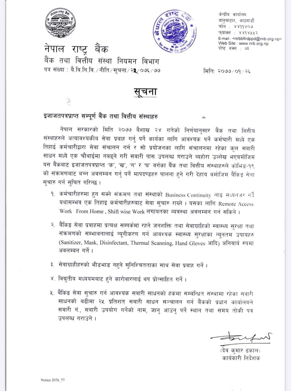 केन्द्रीय बैंकले एक तिहाई कर्मचारीमार्फत सुरक्षाका प्रबन्धहरु अपनाएर सेवा प्रवाह गर्न क, ख, ग र घ बर्गका बैंक तथा वित्तीय संस्थाहरुलाई निर्देशन दिएको छ ।