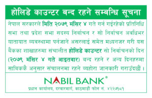 काठमाडौं । नबिल बैंकले सञ्चालन गर्दै आइरहेको होलिडे काउन्टर मंसिर ४ गते बन्द हुने भएको छ ।