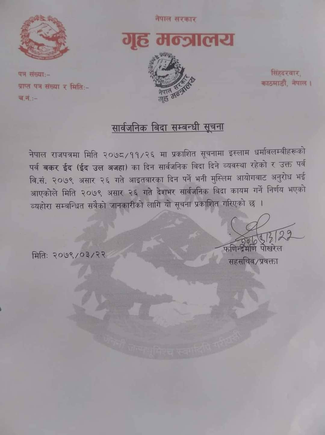 मुस्लिम आयोगको अनुरोधमा असार २६ गते आइतबार बकर इदको अवसरमा बिदा दिईएको गृह मन्त्रालयले जनाएको छ ।
