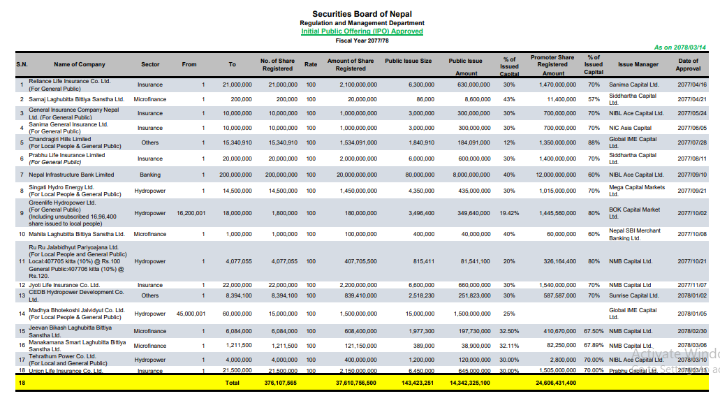 आइपिओ निष्काशनका लागि यस वर्ष १८ कम्पनीले पाए अनुमति, १७ कम्पनीको ५ अर्ब ७१ करोड पाइपलाइनमा
