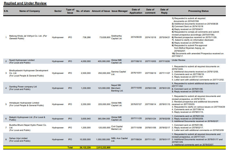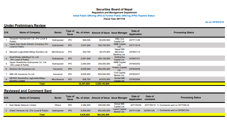अझै १७ वटा कम्पनी प्राथमिक शेयर निष्काशनको अन्तिम अनुमतिको पर्खाइमा छन् । नेपाल धितोपत्र बोर्डका अनुसार १७ कम्पनीले ५ अर्ब ७१ करोड रुपैयाँको प्राथमिक शेयर निष्काशनका लागि निवेदन दिएका छन् । यसमा अधिकाम्स जलविद्युत कम्पनी छन् । त्यस्तै नयाँ जीवन बीमा कम्पनी सानिमा लाइफ र आइएमई लाइफले पनि प्राथमिक शेयर निष्काशनका लागि निवेदन दिएका छन् । डिस होम पनि लामो समयदेखि अनुमतिको पर्खाइमा छ ।