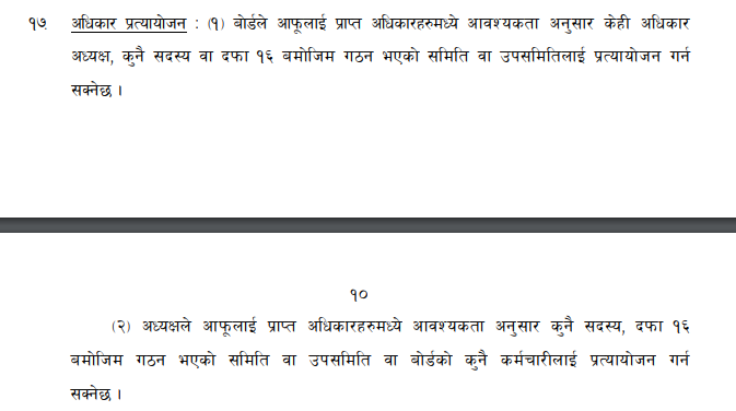 ऐन मै धितोपत्र बोर्डको बोर्डले आफुलाई प्राप्त अधिकार अध्यक्ष तथा कुनै सदश्यलाई दिने व्यवस्था रहेकाले अध्यक्षको अनुपस्थितिमा पनि नियमित काम कारबाहीमा कुनै कानुनी अड्चन नरहेको विज्ञहरु बताउछन् । अहिले बोर्डका अध्यक्षको पद मात्रै रिक्त रहेको अवस्था हो । बाँकी सदश्यहरु नियम अनुसार सबै जना रहेकै अवस्था छ । त्यसमा पनि बोर्डले अध्यक्षलाई दिएको केहि अधिकार अन्य सदश्यलाई पनि दिदा कुनै किसिमको समस्या सिर्जना हुने देखिदैन ।
