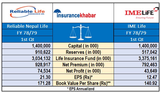 खुद नाफाको आधारमा : कम्पनीले प्रकाशन गरेको आर्थिक वर्ष ७८/७९ को प्रथम त्रैमासको वित्तीय विवरणको आधारमा प्रथम त्रैमास सम्म रिलायबल नेपाल लाइफले ७ करोड ४५ लाख खुद मुनाफा गरेकोमा आइएमई लाइफ इन्स्योरेन्सको खुद मुनाफा ४ करोड ३६ लाख रुपैया रहेको छ। यद्यपि, जीवन बीमा कम्पनीहरुको हकमा भने एक्चुअरी मुल्यांकन हुन बाँकी भएकाले खुद नाफा एक्चुअरी मुल्यांकन पश्चात मात्र वास्तविक आउने छ ।