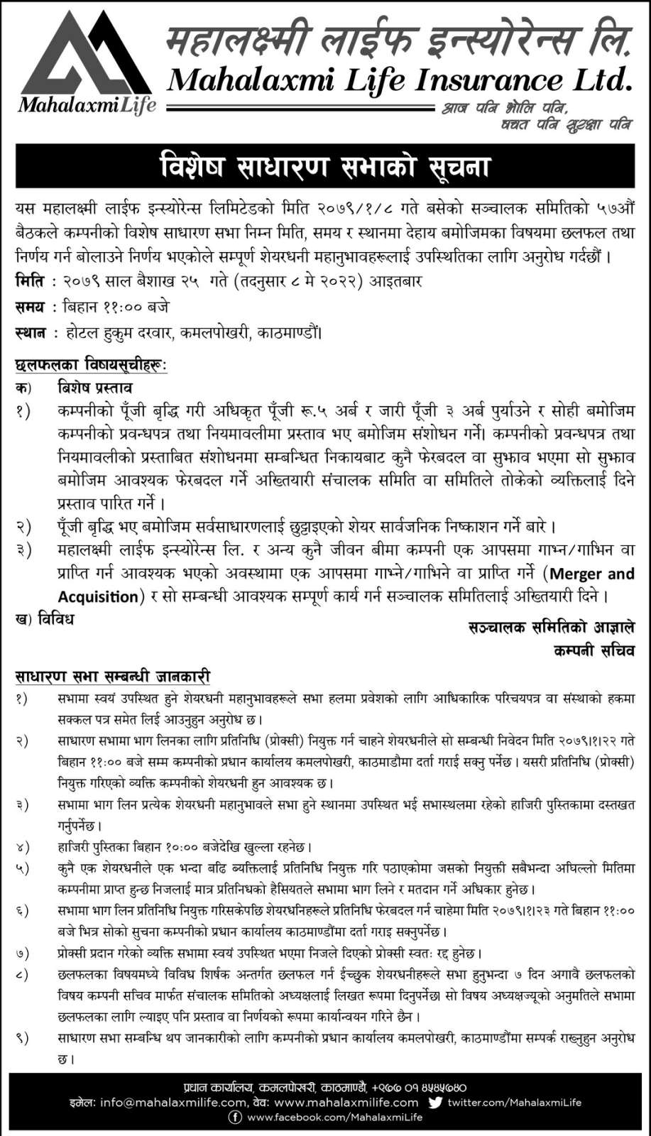 आइपिओ निष्काशन र मर्जरको विशेष प्रस्ताव सहित महालक्ष्मी लाइफले डाक्यो विशेष साधारणसभा