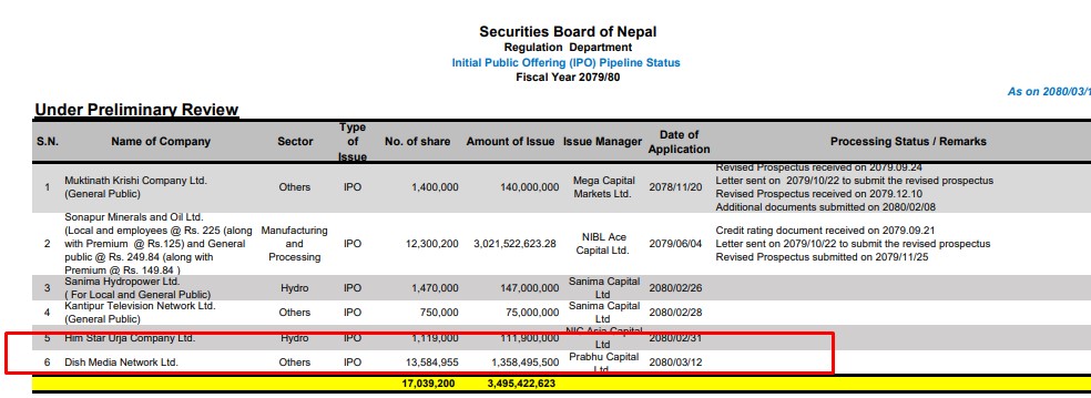 कम्पनीले प्रति कित्ता १०० रुपैयाँ अंकित दरमा १ अर्ब ३५ करोड ८४ लाख ९५ हजार ५०० रुपैयाँ बराबरको १ करोड ३५ लाख ८४ हजार ९५५ कित्ता शेयर निष्काशन गर्न बोर्डमा निवेदन दिएको हो । कम्पनीको शेयर निष्काशन तथा बिक्री प्रबन्धक प्रभु क्यापिटल लिमिटेड रहेको छ ।