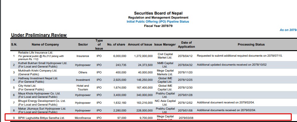 काठमाडौं । बिपीडब्लु लघुवित्त वित्तीय संस्था लिमिटेडले आइपीओ निष्काशन गर्नका लागि नेपाल धितोपत्र बोर्डमा निवेदन दिएको छ । कम्पनीले असार ८ गते बोर्डमा आवेदन दिएको हो । कम्पनीले सर्वसाधारणको लागि प्रति कित्ता एक सय रुपैयाँका दरले ९७ हजार कित्ता आइपीओ निष्काशन गर्न अनुमति माग गरेको हो।