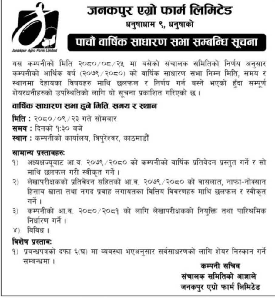 काठमाडौं । जनकपुर एग्रो फार्मले पाँचौं वार्षिक साधारण सभा पुस २३ गते गर्ने भएको छ । उक्त सभा दिनको १ः३० बजे कम्पनीको कार्यालय त्रिपुरेश्वरम ागर्ने जनाएको छ । कम्पनीको मंसिर २५ गते बसेको संचालक समितिको बैठकले उक्त सभाको मिति तय गरेको हो ।