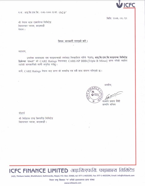काठमाडौं । आइसिएफसि फाइनान्सले २० करोड रुपैयाँ बराबरको ऋणपत्र निष्काशन गर्न रेटिङ्ग गराएको छ । कम्पनीले गराएको रेटिङ्गमा केयर रेटिङ्ग नेपालले मध्यम सुरक्षा जनाउने केयर एनपी बीबीबी (ट्रिपल बी माइनस) रेटिङ्ग प्रदान गरेको छ ।
