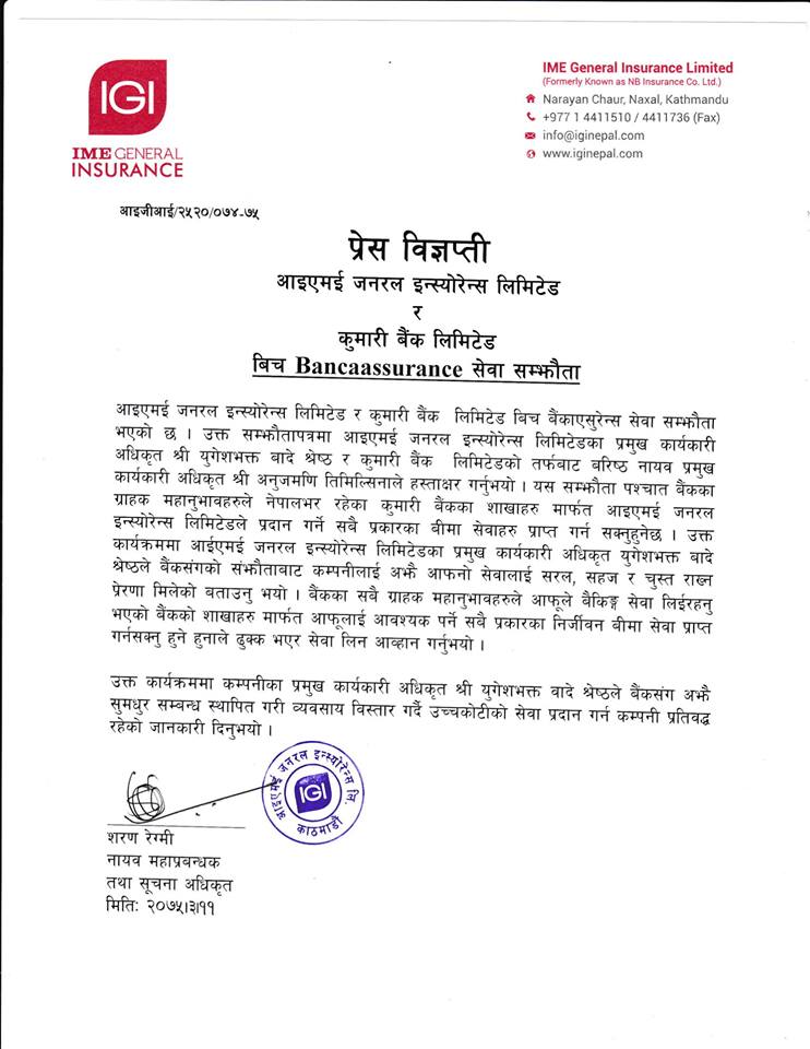 सम्झौता अनुसार, अब बैङ्कका ग्राहक महानुभावहरूले कुमारी बैङ्कका देशभरिका शाखाबाट आईएमई जनरल इन्स्योरेन्सले प्रदान गर्ने सबै प्रकारका निर्जीवन बीमा सेवा प्राप्त गर्न सक्ने छन्।