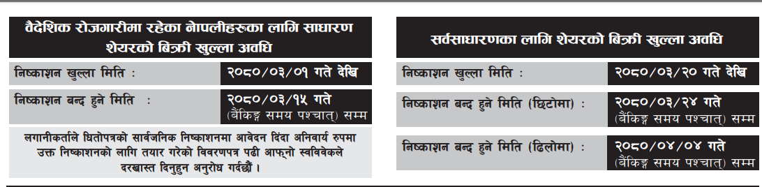 वैदेशिक रोजगारीमा रहेका नेपालीले मात्र आवेदन दिन मिल्ने आईपीओ असार १ गते देखि असार १५ गते सम्म खुल्ने छ ।