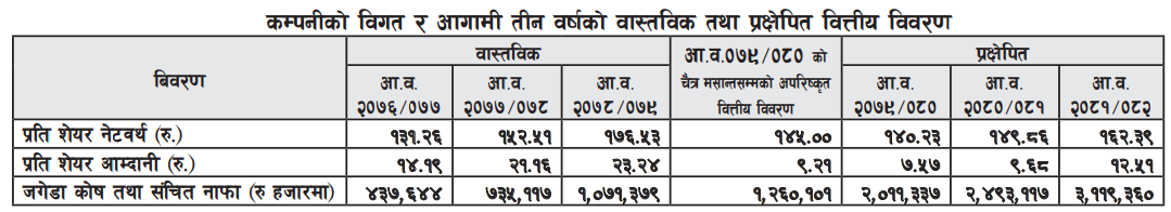 प्रक्षेपित तथ्यांक अनुसार आर्थिक वर्ष ८१/८२ मा प्रति शेयर आम्दानी १२ रुपैयाँ ५१ पैसा र किताबी मूल्य १६२ रुपैयाँ ३९ पैसा हुन्छ ।